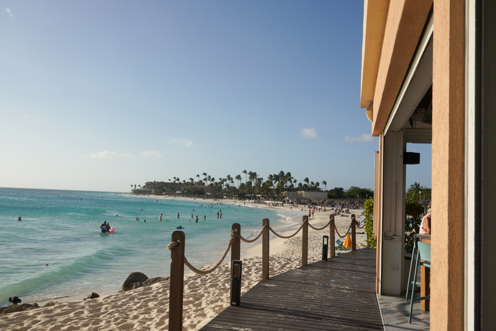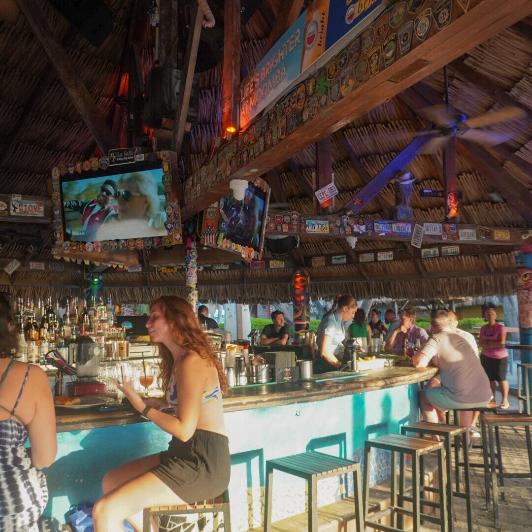 Divi Beach Bar sits directly on Eagle Beach, one of the widest stretches of sand on the island. It gets busy, especially during peak hours, but the atmosphere feels different from the Palm Beach pier spots. The crowd is mostly resort guests and beachgoers staying nearby rather than people coming specifically for music or happy hour events. You’re seated right by the water with full beach views, and even when it’s active, it doesn’t revolve around live entertainment. The focus is more on being steps from the ocean, ordering lunch, and staying close to your beach setup. The menu covers beach bar staples along with cocktails and frozen drinks. It’s convenient if you’re in the Eagle Beach area and want something right on the sand